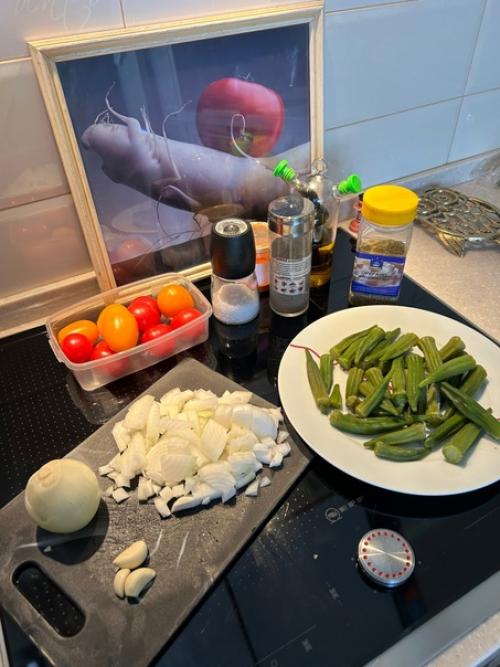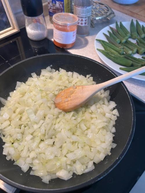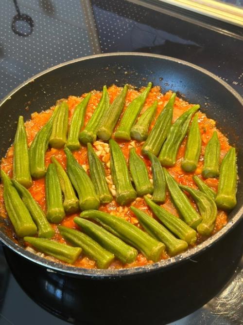 Лук чуть обжарить на оливковом масле, до первых золотых, затем чеснок, потом томаты. Всё соединить и выложить бамию.