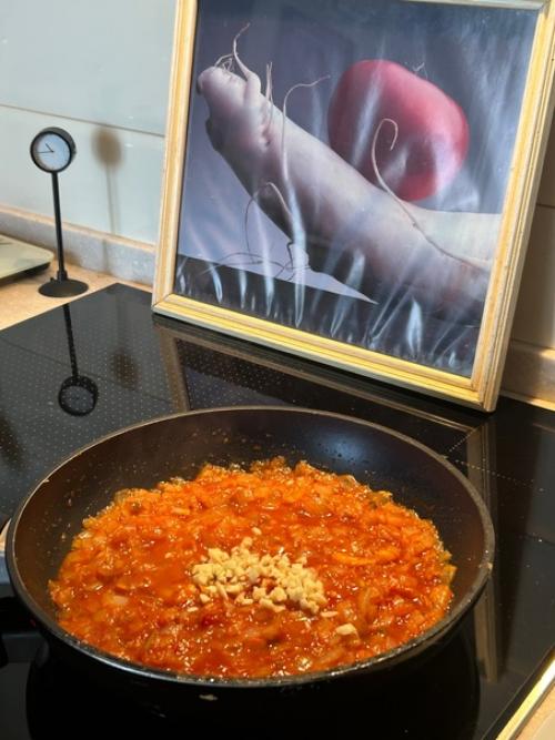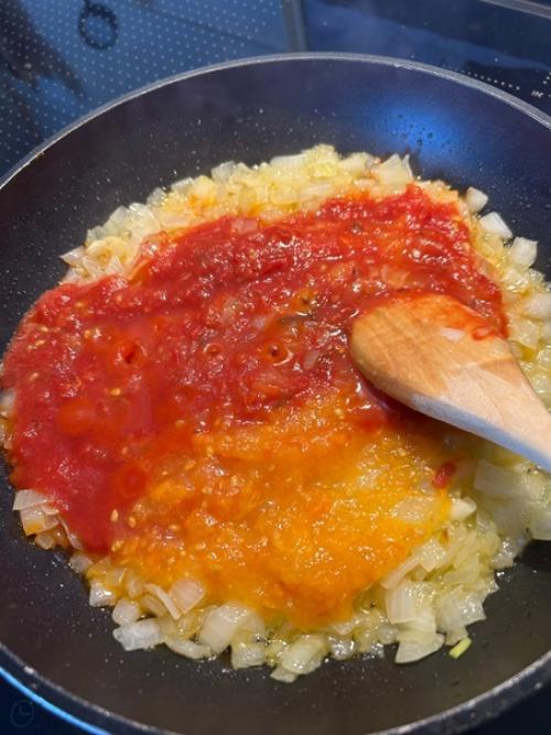 Помидоры на терке, любые или томатную пасту, можно и в собственном соку. Тоже будет вкусно.