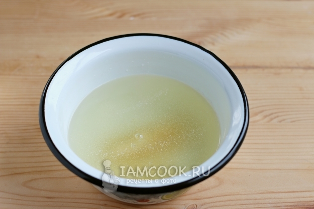 В первую очередь откроем банку с консервированными ананасами и сольем с нее сок в миску, добавим в этот сок воды, чтобы общая масса жидкости была 400 мл. Всыплем быстрорастворимый желатин, размешаем и дадим ему разбухнуть. Через 5 минут нагреем желатин до 60 градусов и оставим остужаться.