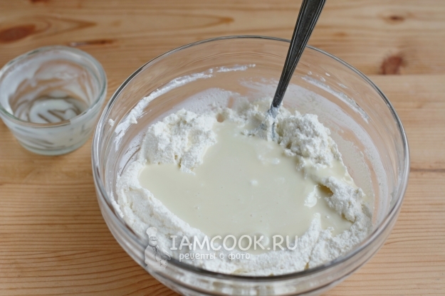 Далее вливаем в творожную массу сгущенное молоко.