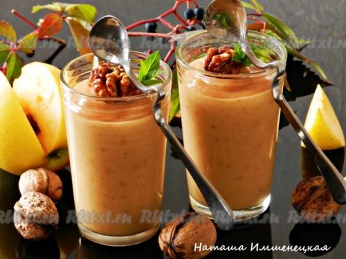 Можно ещё добавить корицу, но это по желанию. Взбить яблочное пюре с бананом погружным блендером до получения однородной, пышной массы.