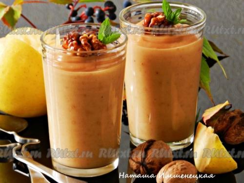 При подаче я смузи обжаренными грецкими орехами в мёде украсила. Вкусный и полезный смузи, приготовленный из яблок с бананом и молоком, перед подачей можно охладить в холодильнике, а можно сразу насладиться этим напитком. Приятного аппетита, радуйте своих близких!