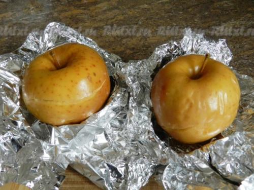 Яблоки вымыть, завернуть в фольгу и запечь в разогретой духовке в течение 30 минут при температуре 190-200 градусов.