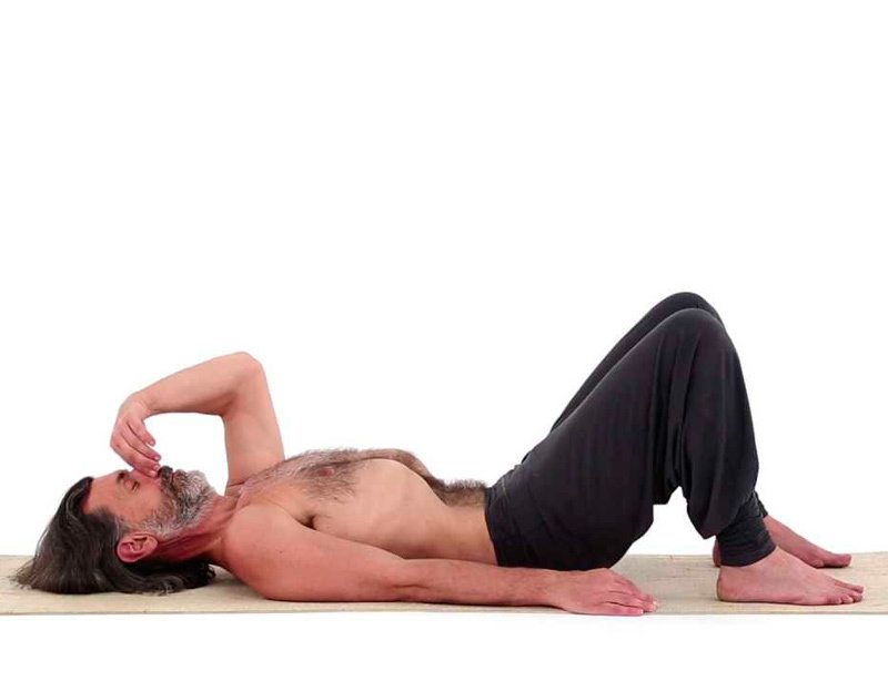 № 5. Первоначальная позиция лежа на животе, лоб касается поверхности пола, руки сгибаем, ладони на полу в области плечевых суставов. Делаем вдох и в это время медленно поднимаем туловище. Прогиб не должен быть глубоким, в финальной стадии нижние ребра покоятся на полу. Выдыхая, поворачиваем глаза, голову, плечи в левую сторону. Замираем в этой позе на 3-5 дыхательных циклов. Опускаемся на пол, делаем паузу и производим такое же действие вправо.