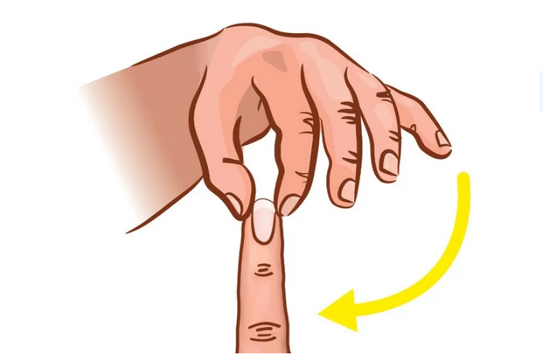 Воспользуйтесь большим и указательным пальцами правой руки – сделайте надавливающее движение на верхнюю область большого пальца левой руки, при этом сжимая корень ногтя.